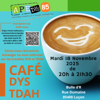 Nous tenons à vous informer du prochain Café-Dys/TDAH, organisé par APEDYS85, qui se déroulera le Mardi 18 novembre 2025 de 20h à 21h à Luçon. Plus précisément, [+]
