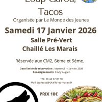Le « Monde des jeunes » organise un événement « LOup Garou et Tacos » le samedi 17 janvier 2026 à la salle du Pré Vert. Retrouvez le flyer et le formulaire [+]