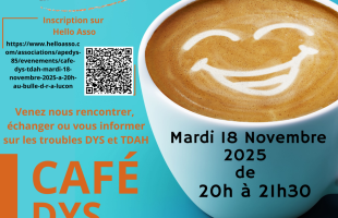L’objectif de ce Café-Dys/TDAH est de pouvoir se rencontrer, échanger et s’informer sur les troubles DYS et TDAH, lors d’un moment convivial, autour d’une boisson et de quelques gâteaux.